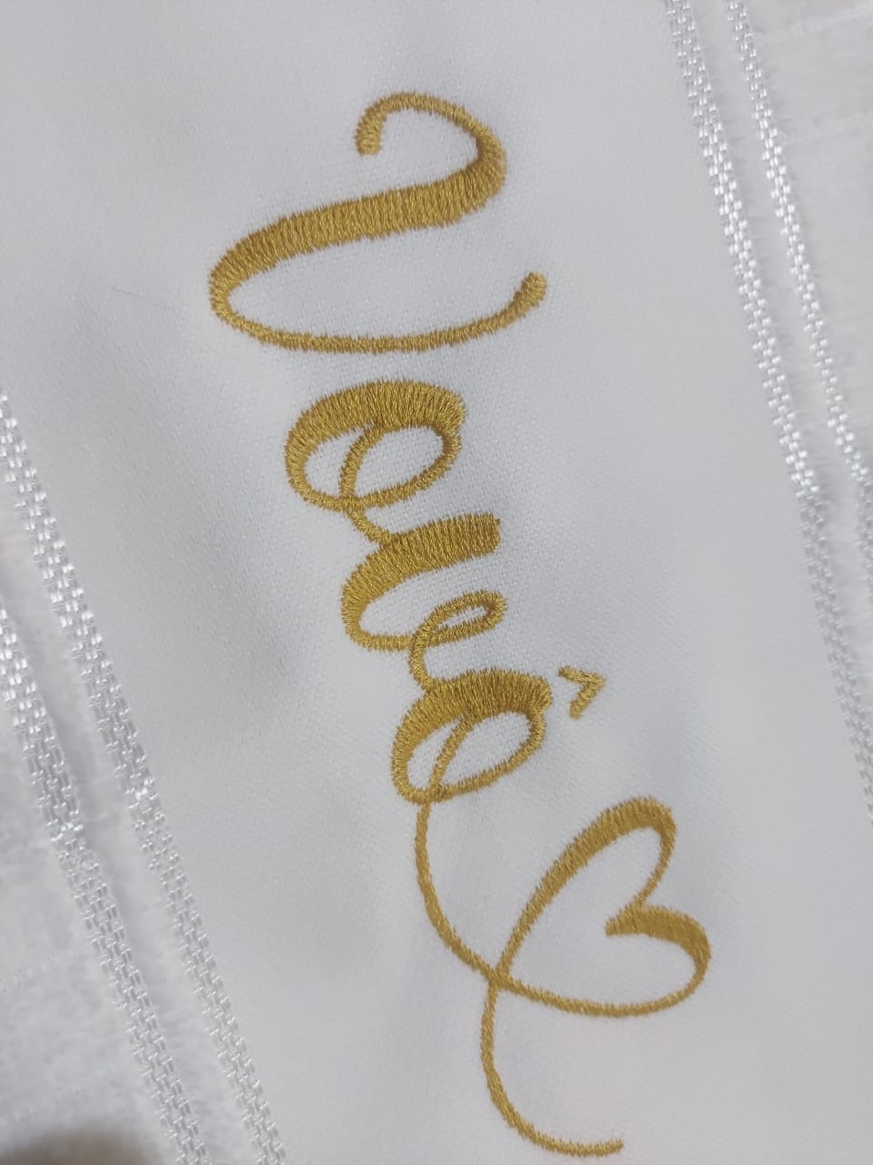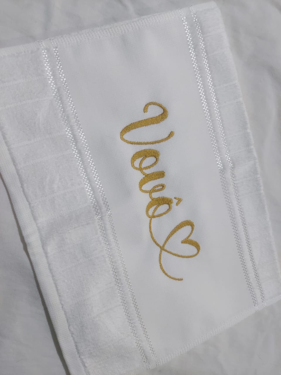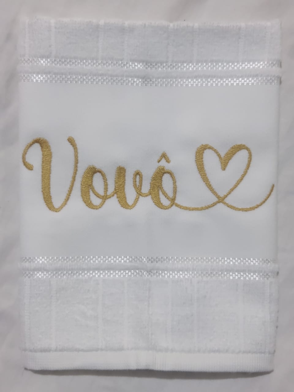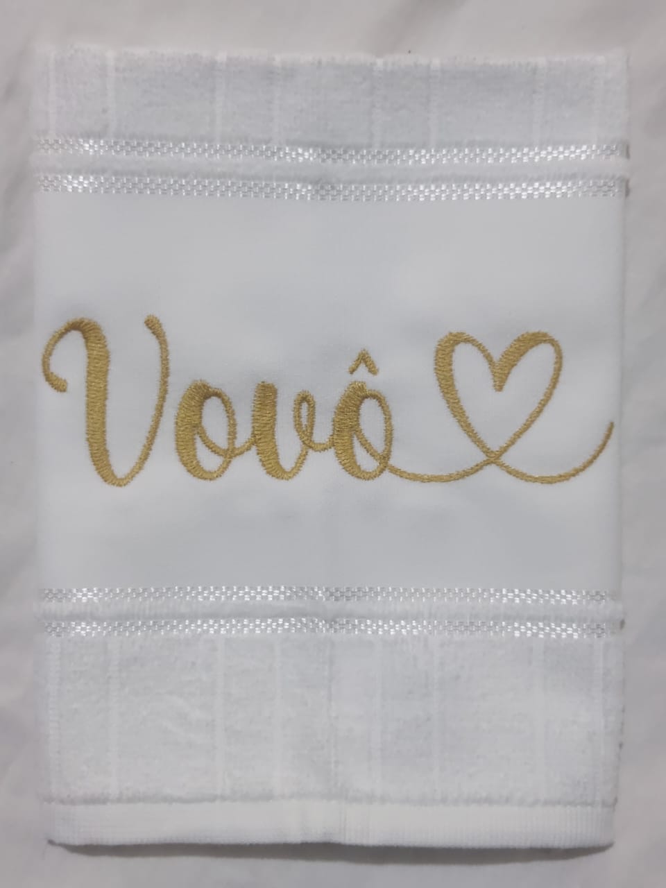 Toalha branca c/ bordado nome vovô com coração ao final do nome, cor da linha em dourado.